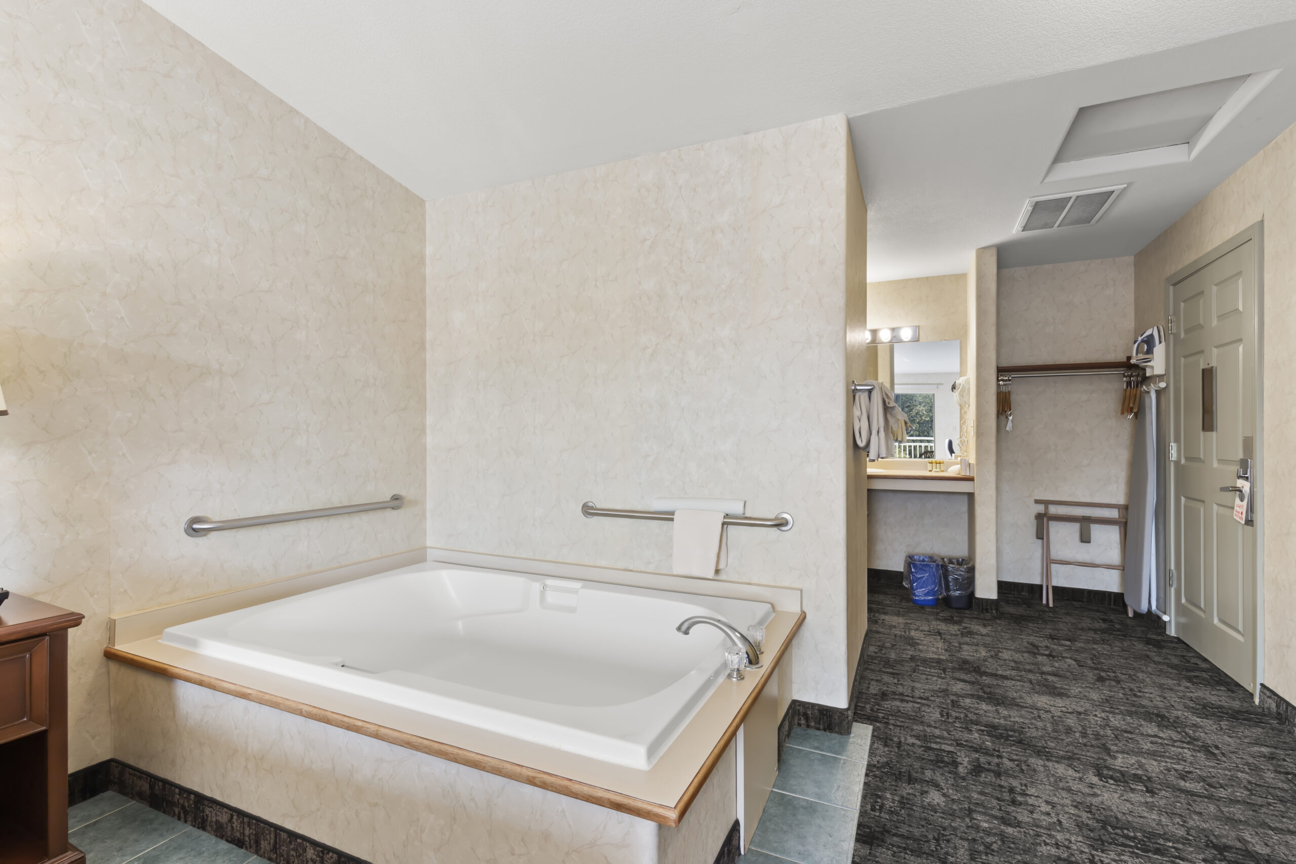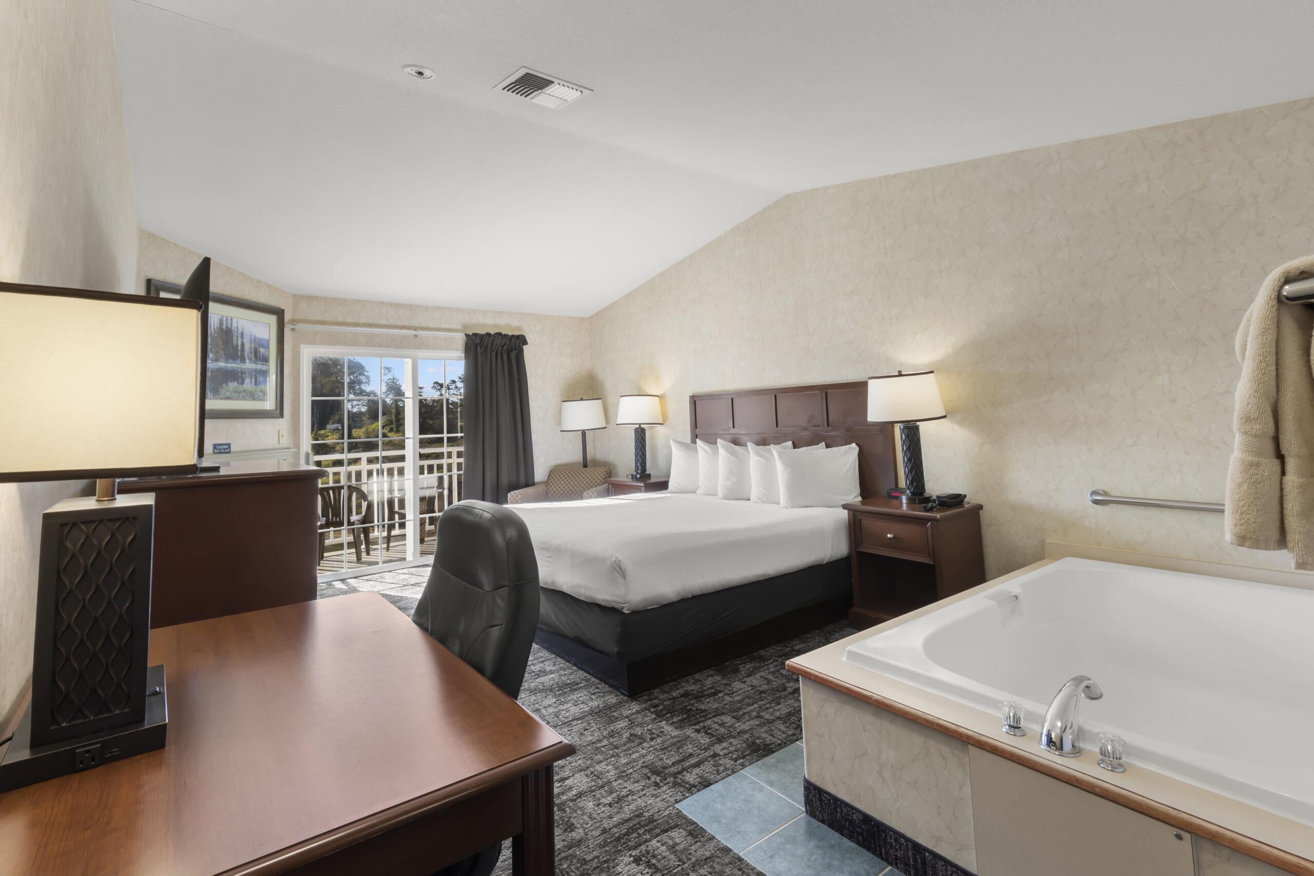 • Indulge in luxury at Beach House Inn's King Soaking Tub Room, a serene retreat along California's captivating coastline. This meticulously curated room features, a plush king-size bed for restful nights, and a cozy seating area. However, the highlight is the indulgent soaking tub, offering blissful relaxation with views of the Pudding Creek Estuary. Modern amenities including complimentary Wi-Fi, a flat-screen TV, and a mini-refrigerator ensure convenience, while the prime location provides easy access to outdoor activities and nearby attractions like the Glass Beach and Mendocino Coast Botanical Gardens. Unwind on the balcony, soaking in breathtaking views of the estuary. Book your stay today and experience the ultimate coastal getaway at Beach House Inn. Pet friendly options are available.